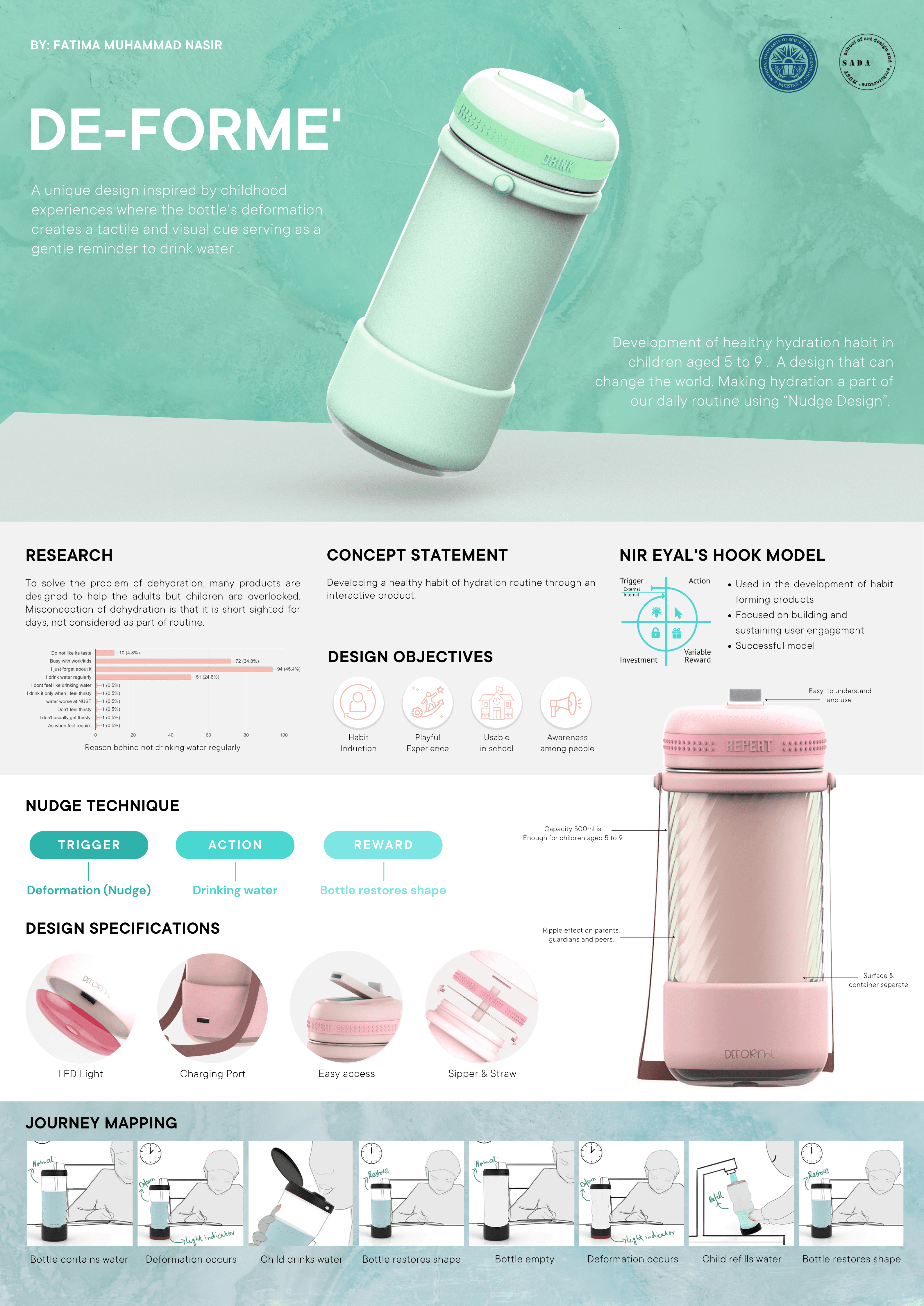 A unique design inspired by childhood experiences where the bottle's deformation creates a tactile and visual cue serving as a gentle reminder to drink water. The design ensures development of healthy hydration habit in children aged 5 to 9. A design that can change the world, making hydration a part of our daily routine using “Nudge Design”. The project was presented at the WDO Research and Education Forum 2023 that took place on the first day of the World Design Assembly at Chiba University’s Design and Research Institute in Tokyo (Japan). Hosted by the Japan Institute of Design Promotion, the Forum explored the theme of Design Beyond and aimed to share perspectives and ongoing research demonstrating the future impacts of design across different human, technological and planetary contexts.