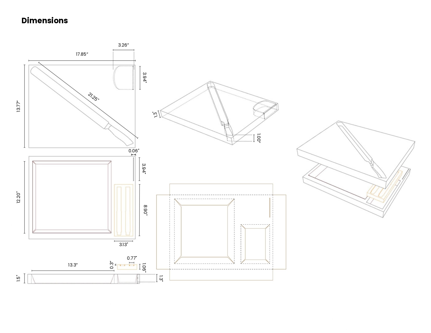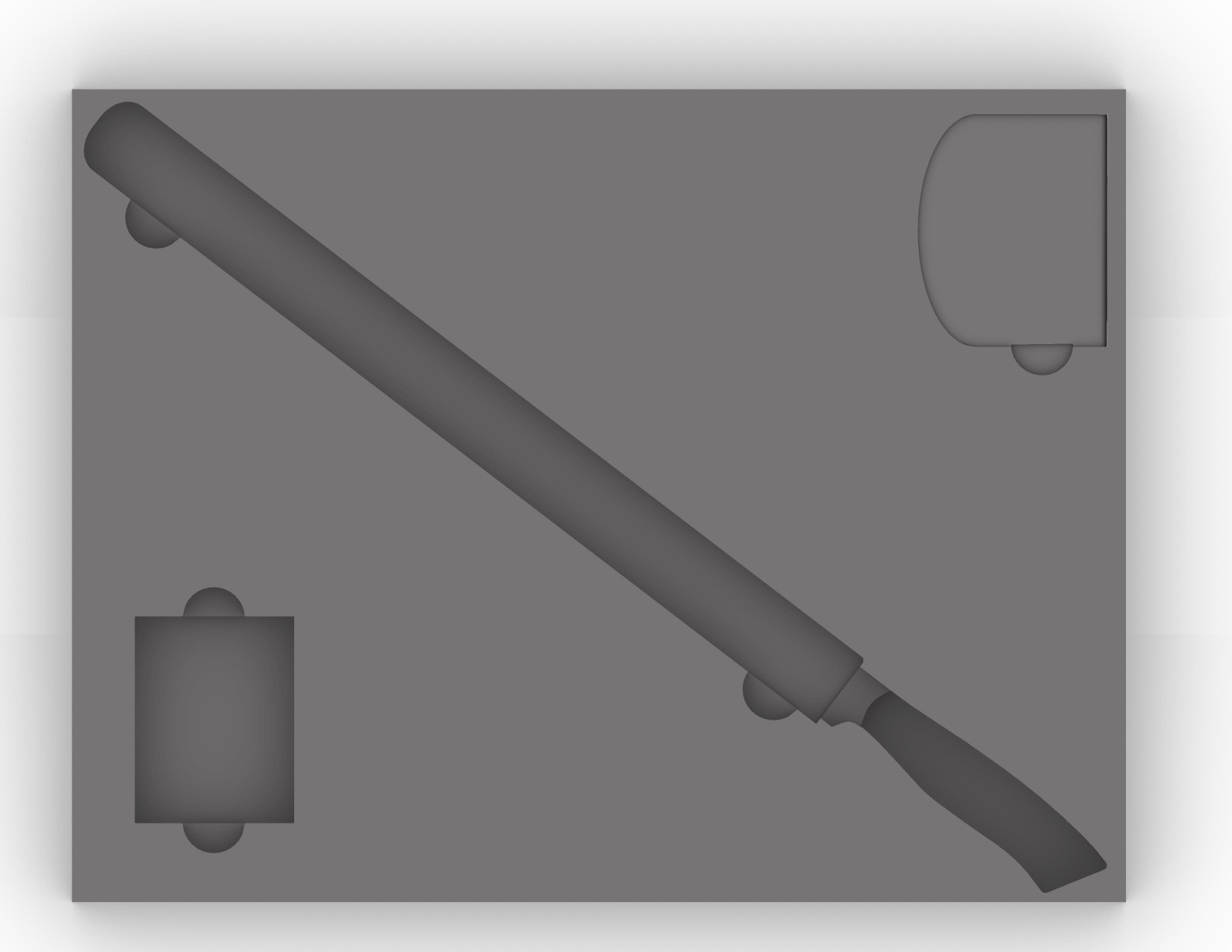 A fully custom packaging system designed from first principles for a multi-component knife set. The structure integrates dedicated cavities for a cutting board, primary knife, stop bracket, and auxiliary cylindrical components, ensuring positional stability and impact protection.The layout is geometry-driven, aligning each element for efficient assembly, intuitive access, and minimal material waste. Internal channels and recesses are optimized for secure retention while maintaining clean extraction. The outer box and internal tray operate as a unified system, balancing rigidity with manufacturability.Two complete model iterations were developed to refine spatial organization, tolerances, and user interaction. The final outcome prioritizes protection, clarity of arrangement, and production feasibility.