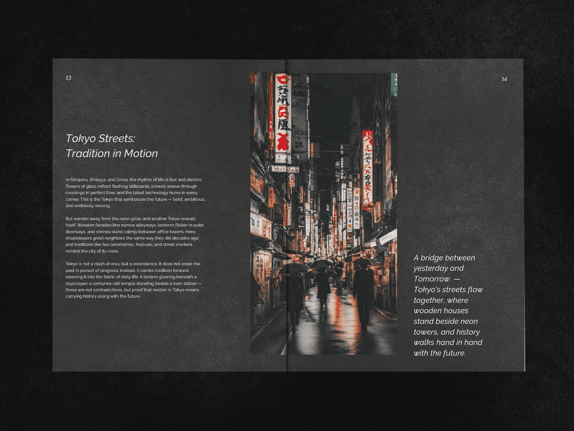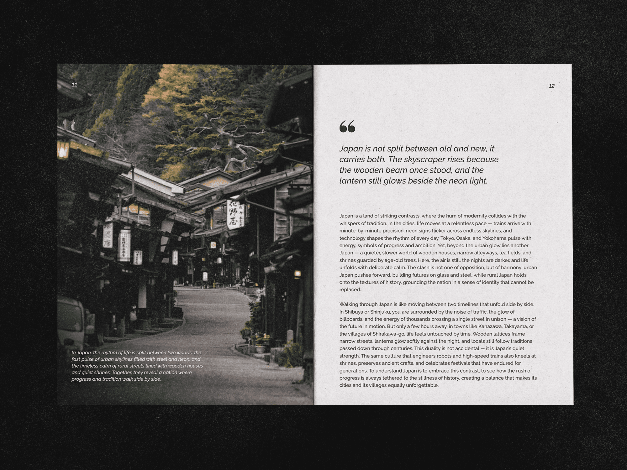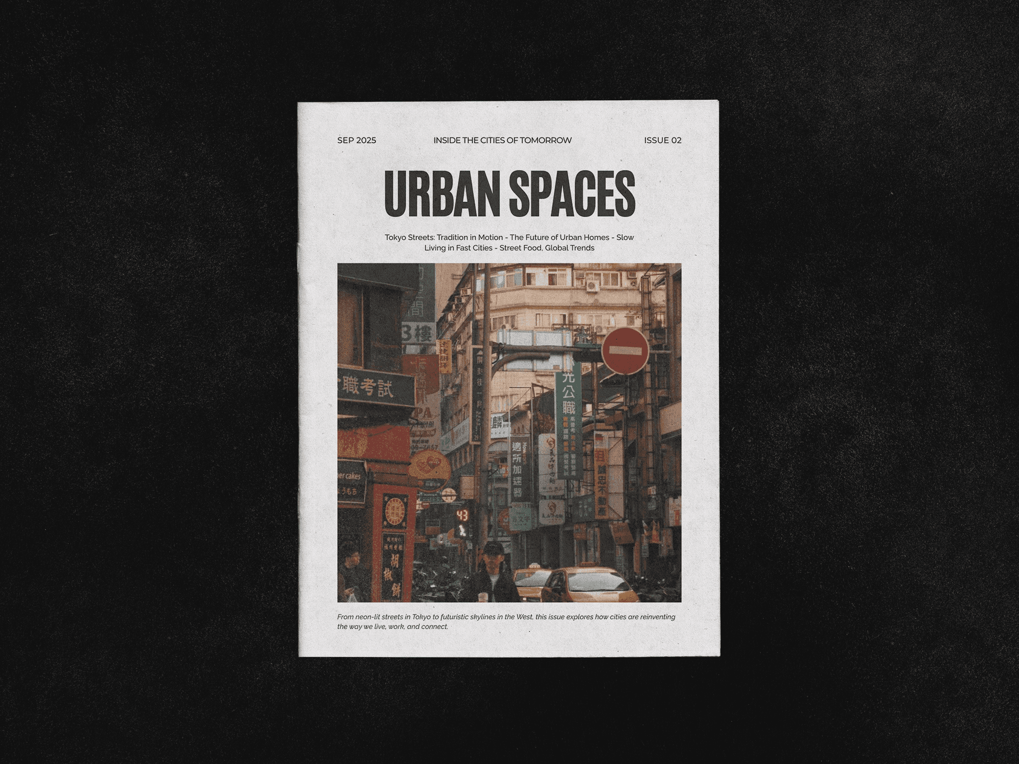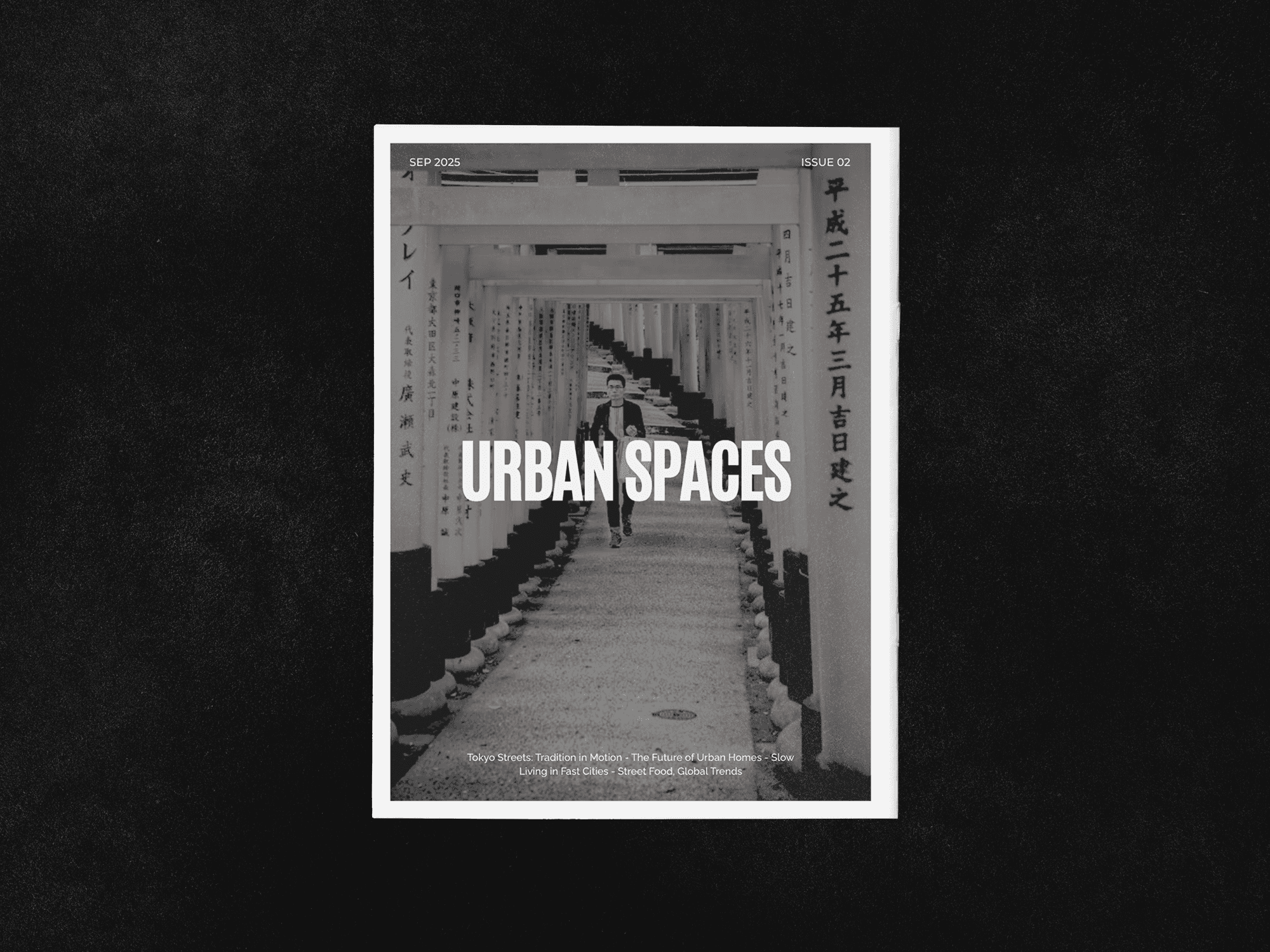 Urban Spaces is a concept magazine exploring the balance of tradition and modernity in city life. This issue focuses on Japan, using colors and imagery that reflect the character of its streets, from lanterns and wooden facades to bold signage and urban forms. The design combines storytelling and photography to capture the layered, atmospheric quality of Japanese spaces.Rather than simplifying, the pages bring forward detail, the textures of architecture, the movement of people, and the contrasts that shape daily life. It is a study of how cities carry their history while evolving, presented through a design that feels both grounded and full of expression.