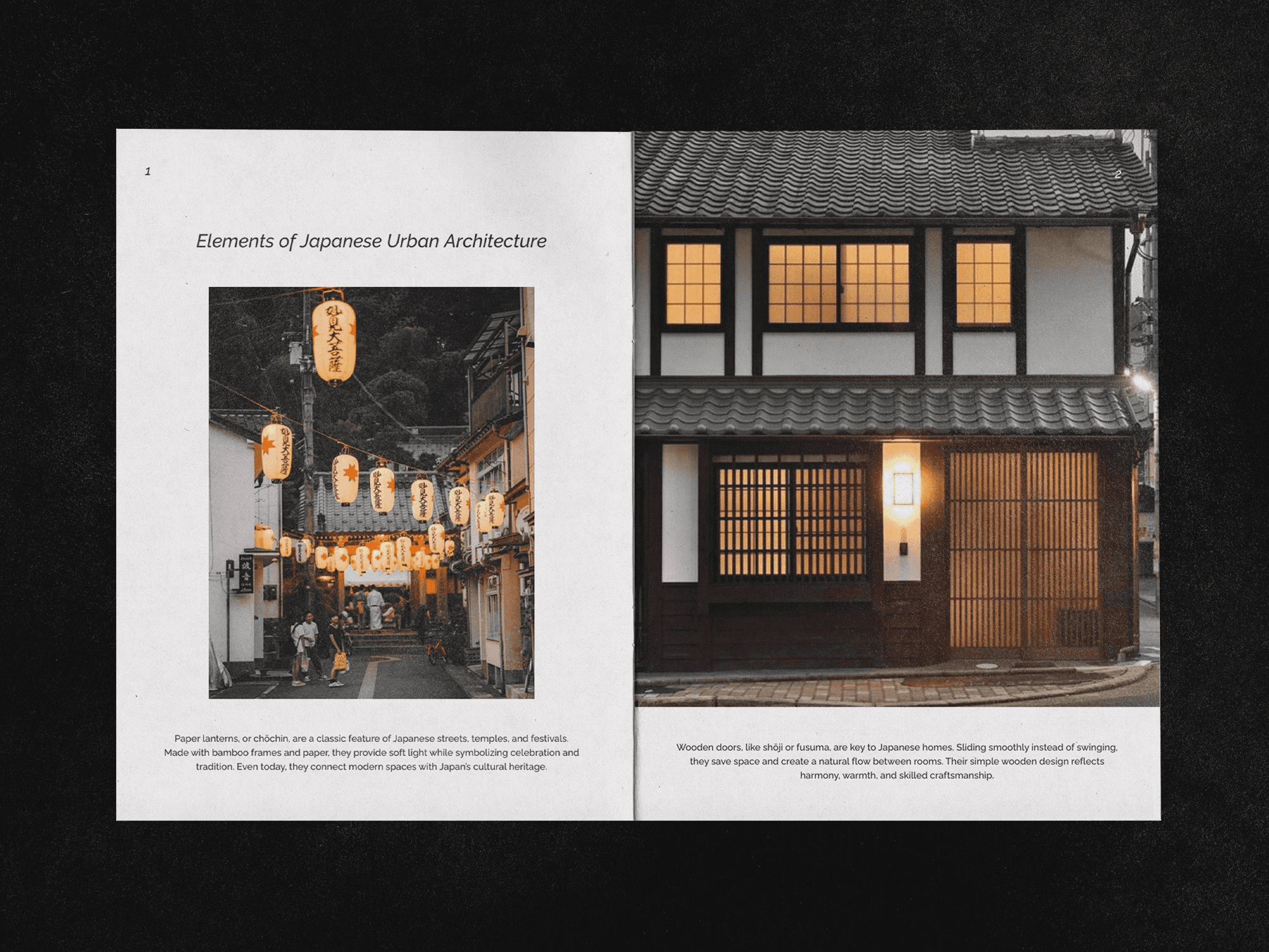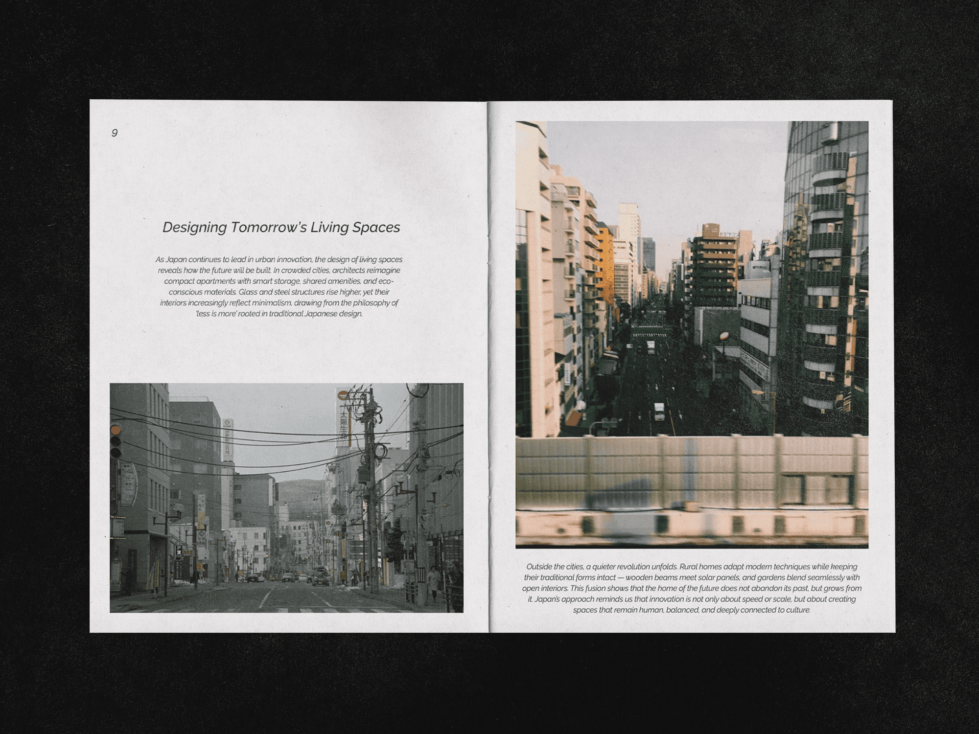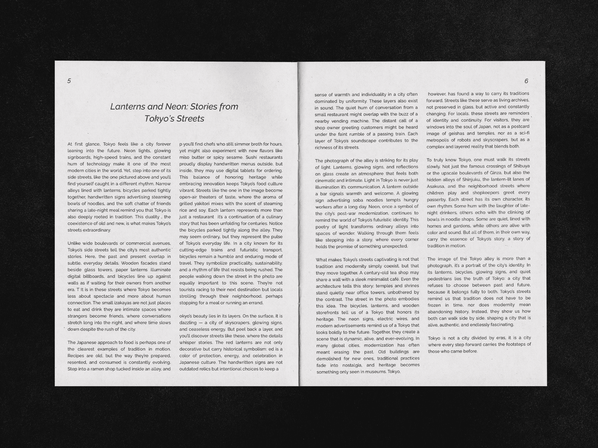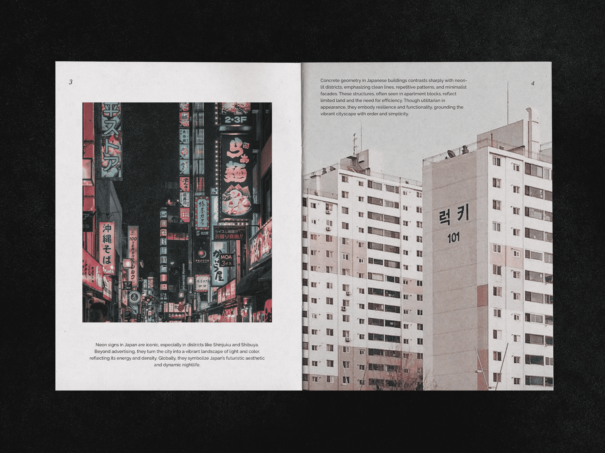 Urban Spaces is a concept magazine exploring the balance of tradition and modernity in city life. This issue focuses on Japan, using colors and imagery that reflect the character of its streets, from lanterns and wooden facades to bold signage and urban forms. The design combines storytelling and photography to capture the layered, atmospheric quality of Japanese spaces.Rather than simplifying, the pages bring forward detail, the textures of architecture, the movement of people, and the contrasts that shape daily life. It is a study of how cities carry their history while evolving, presented through a design that feels both grounded and full of expression.