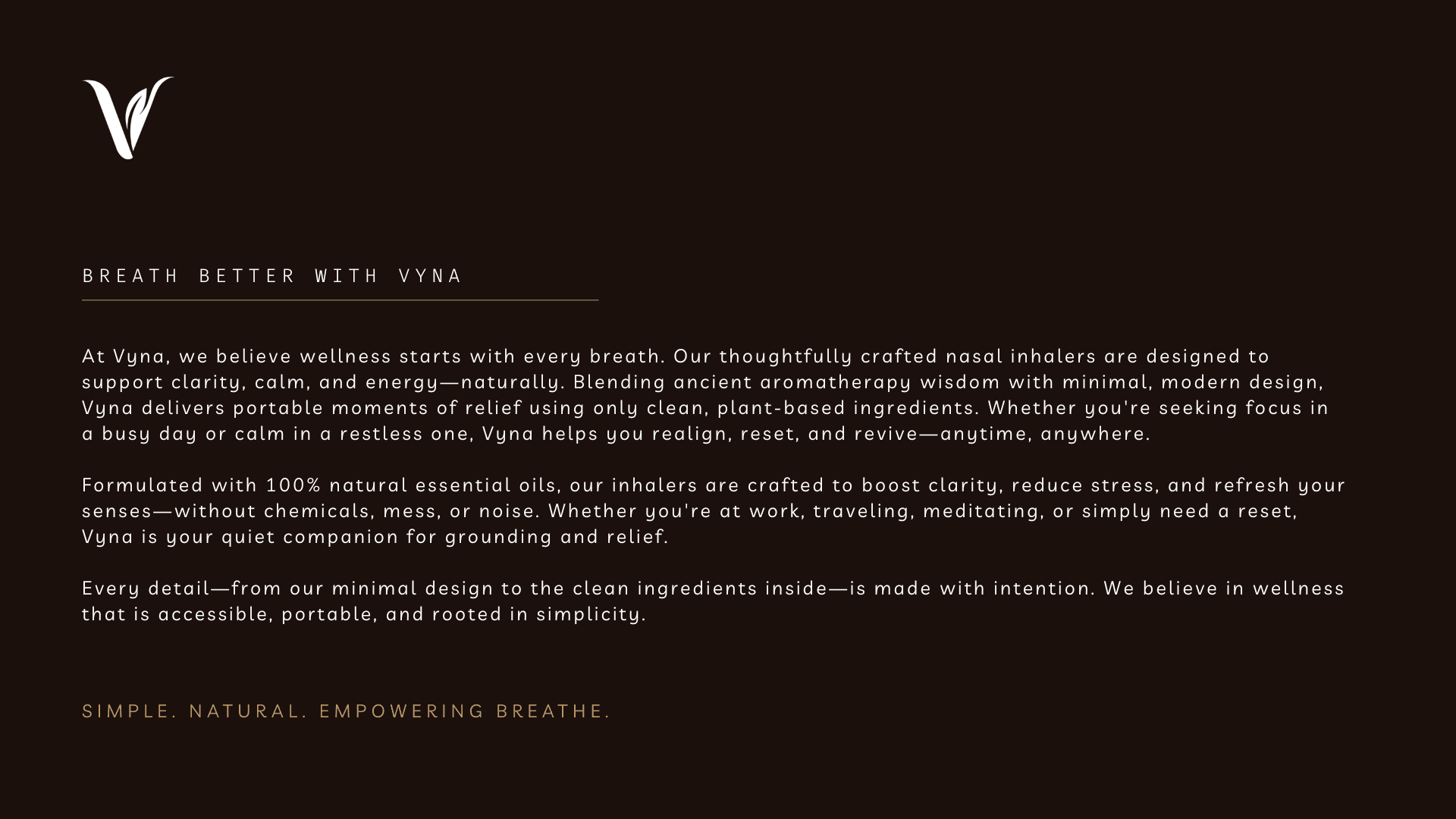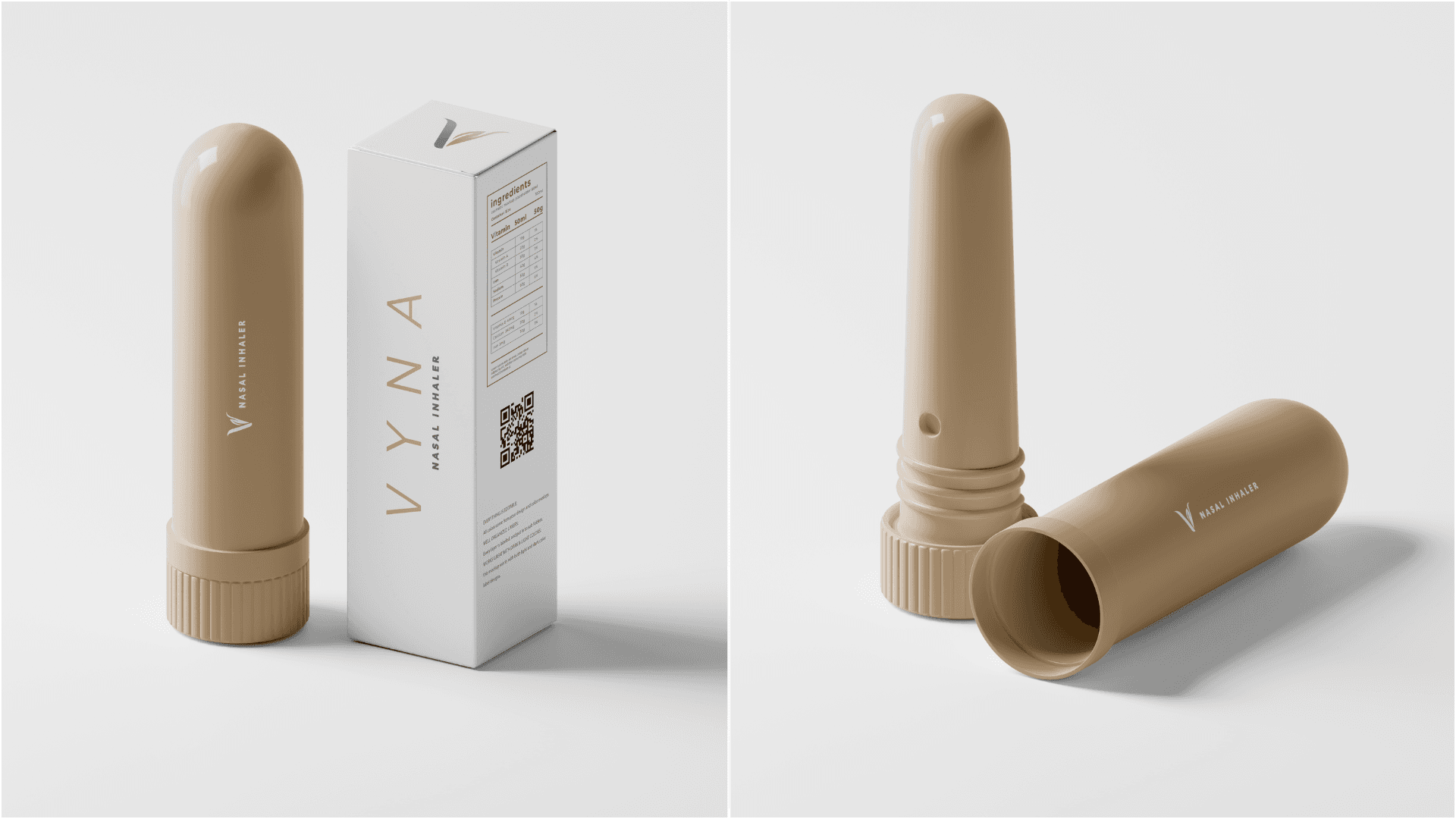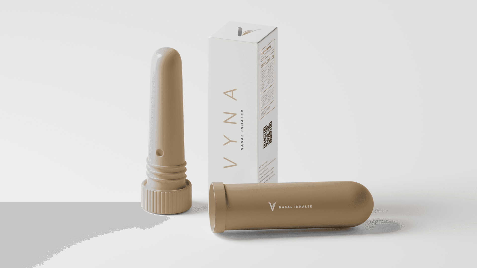 Vyna is a conceptual wellness brand created to embody clarity, calm, and mindful living. This branding project includes a cohesive identity system featuring logo design, packaging, color tones, and print applications. Inspired by natural aromatherapy and plant-based ingredients, the visual direction combines minimal aesthetics with purposeful design.Clean typography and calming color tones were chosen to reflect simplicity, breathability, and modern wellness. The portable inhaler concept is expressed through structured yet gentle visuals, reinforcing ease and accessibility. Every detail communicates Vyna’s philosophy of intentional wellbeing.